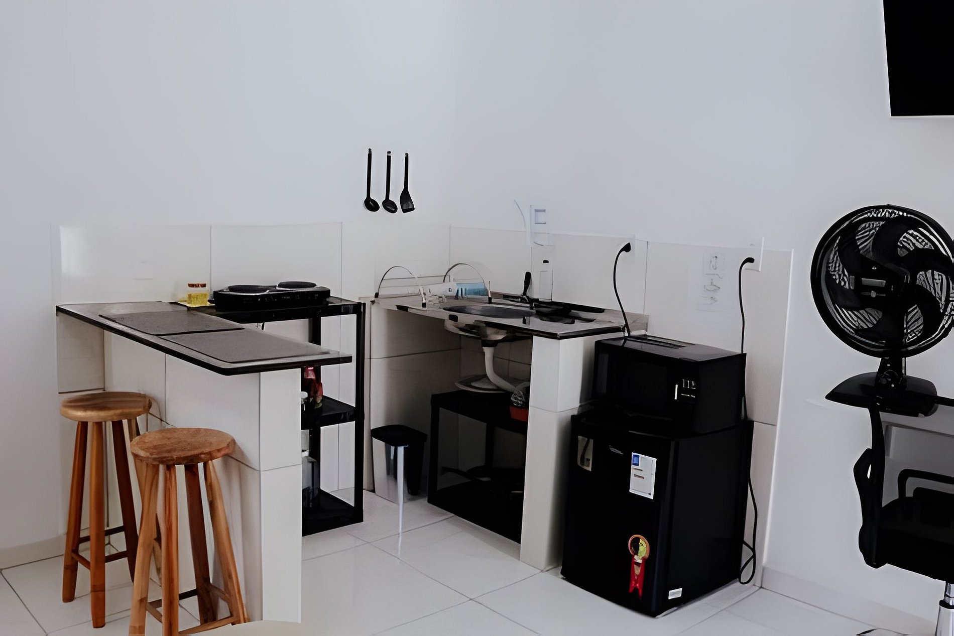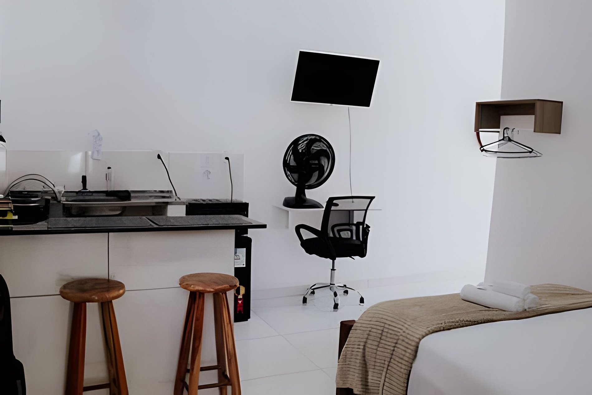 A Kitnet 1 foi pensada para oferecer praticidade com toque de aconchego. O ar-condicionado garante conforto térmico, a cama é confortável e a Smart TV com acesso à internet proporciona entretenimento para todos os gostos. A cozinha é equipada com utensílios básicos para preparar refeições e há um espaço funcional para estudo ou trabalho remoto. A decoração clara e acolhedora valoriza a experiência dos hóspedes.